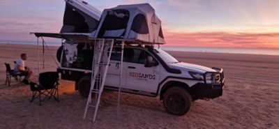 Den tur- og campingriggede Hiluxen hentes i garasjen hos Red Sand Campers